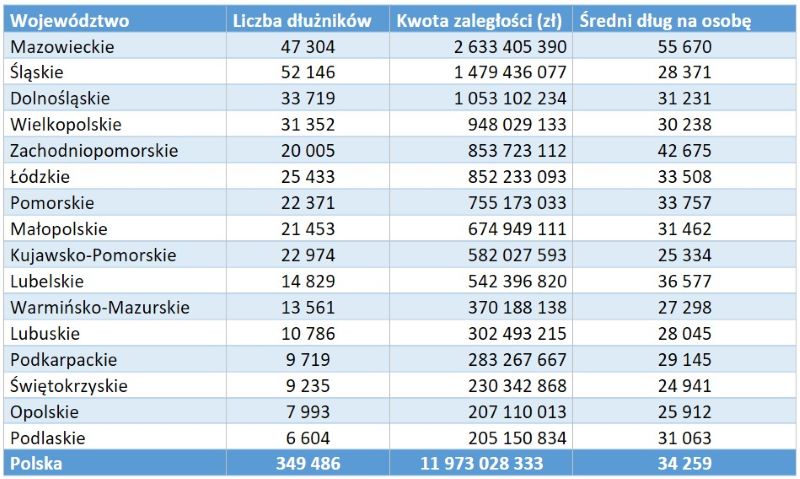 • Najwięcej zadłużonych seniorów mieszka na Śląsku (51 077), natomiast najwyższe średnie kwoty zaległości (kredytowych i pozakredytowych) notuje Mazowsze;